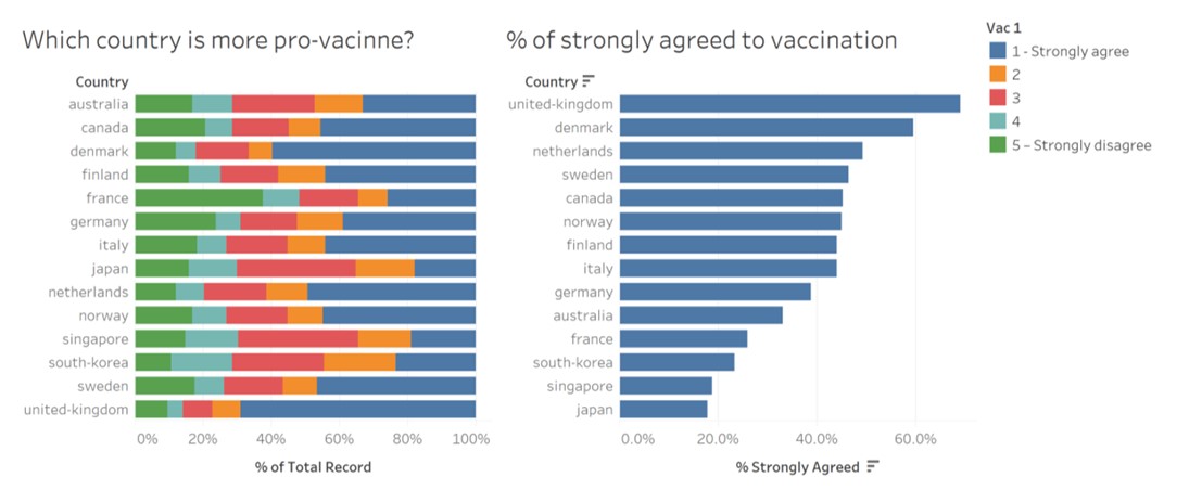 - The title of the chart on the left side does not well revealed by the visualization, since the percentage of “1 - Strongly agree” is disordered. (Suggestion: It could be more informative if we either highlight the highly pro-vaccine countries or use descending order to display the percentage of “1 - Strong agree”.)