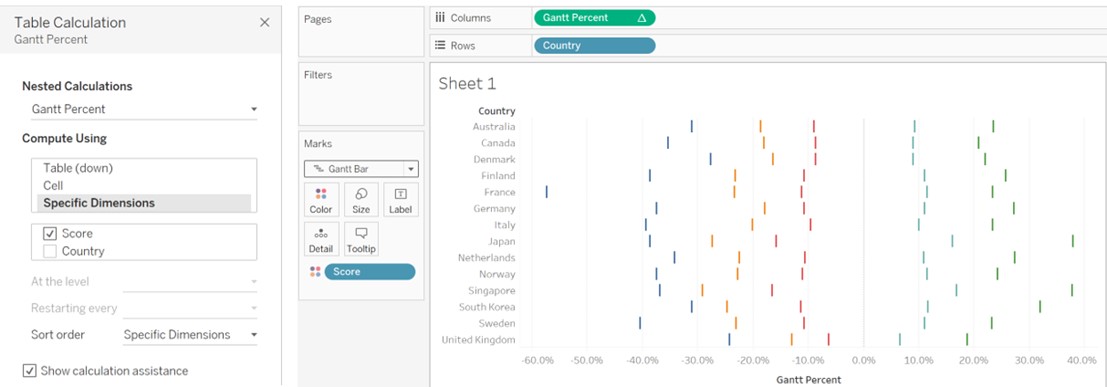 Drag “Gantt Percent” to “Column”, and “Country” to “Row”. Then add “Score” to “Color”. After that, edit table calculation for “Gantt Percent” and computing using “Score”. Last but not least, change “Automatic” to “Gantt Bar”.