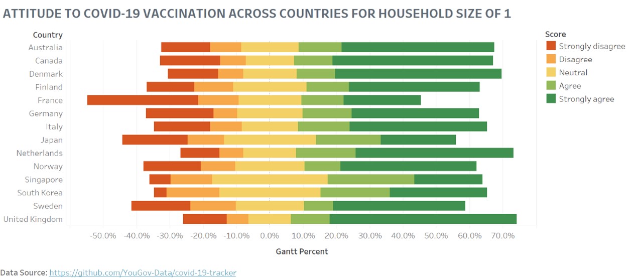 - The percentage of “Strongly disagree” for France accounts for a relatively great percentage among all the countries and household size, and the Gantt bar tend to the left side, which indicate severe mood of anti-vaccination.