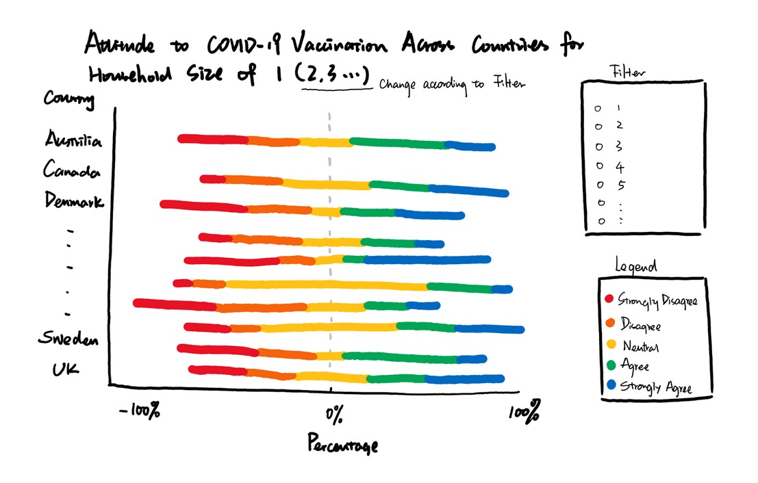 - The bar chart on the right side is shown in one color which can be improved for better differentiation. (Suggestion: Use various colors to represent for each country or according to their degree of pro-vaccine.)