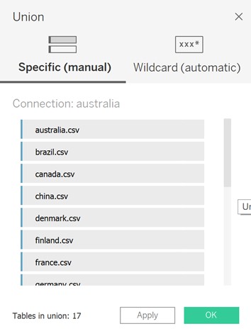 - Unzip all the zip files and put them in the same folder, then drag australia.csv into Tableau, the Tableau will automatically recognize all the csv files in the folder. We can add other country's data files by double clicking “New Union”.