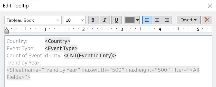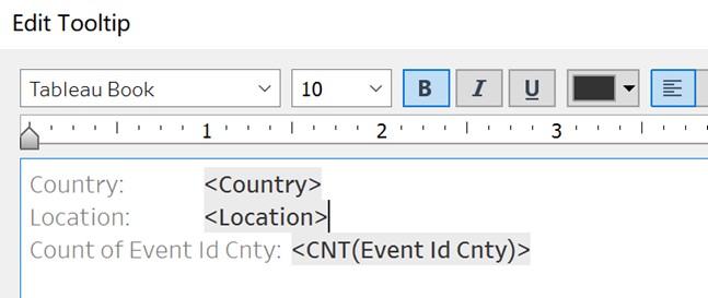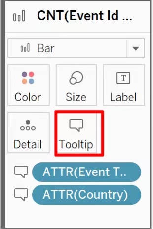 - Drag ‘Event Type’ and ‘Country’ to Tooltip.