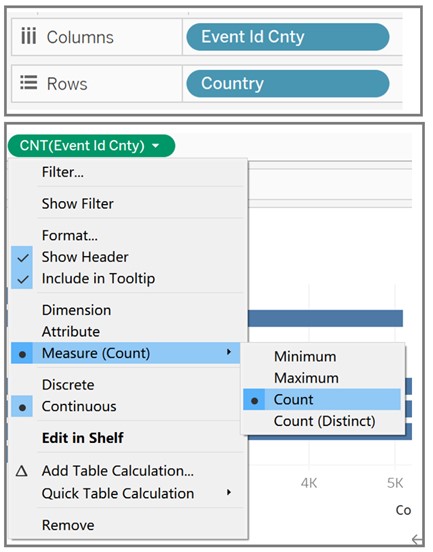 - Drag ‘Event Id Cnty’ and ‘Country’ to Columns and Rows respectively and set Measure of ‘Event Id Cnty’ as ‘Count’.