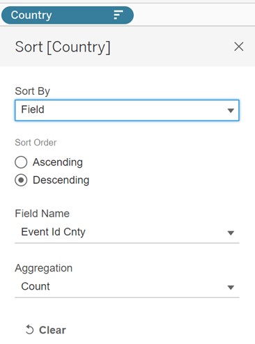 - Sort ‘Country’ by Count ‘Event Id Cnty’ Field using descending order.