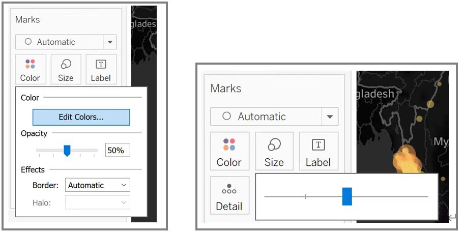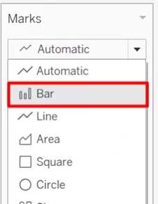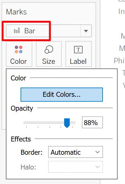 - Set Marks as ‘Bar’, then edit color, size and opacity of bars.