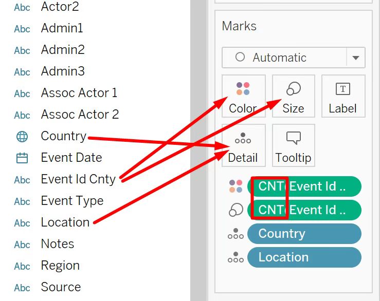 - Drag ‘Event Id Cnty’ to Color and Size and set measure of both to Count. Then Drag ‘Country’ and ‘Location’ to Detail.