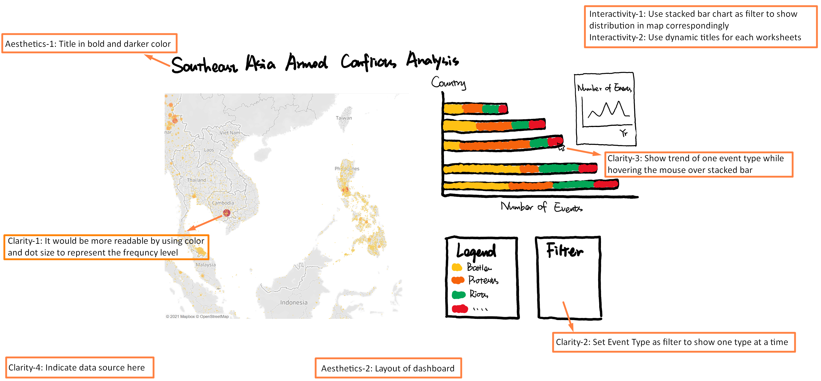 - Dots in geographical map are overlapped, resulting in events with low frequency such as ‘Riots’ and ‘Strategic developments’ cannot be easily recognized.