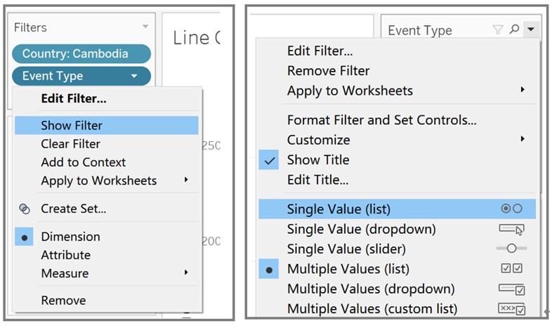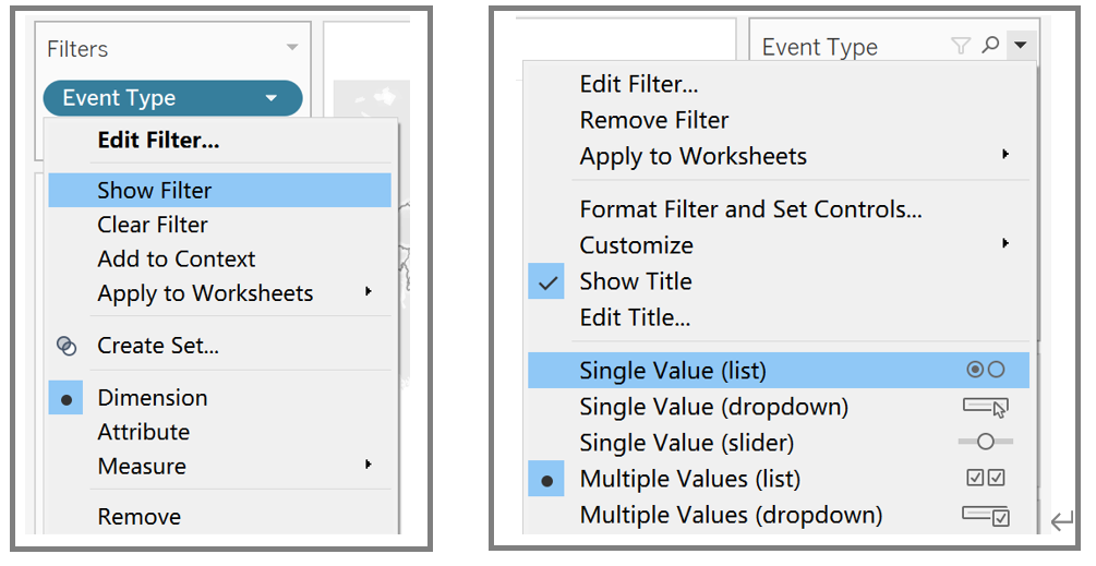 - Drag ‘Event Type’ to Filters and select Show Filter from the drop-down list. Change filter type to Single Value (list).