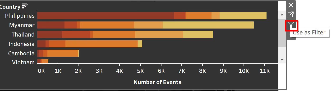 - To visual the geographical distribution, readers can only choose one country at a time instead of comparing the frequency of armed conflicts among different countries, since single-valued filter button is used for both charts.
