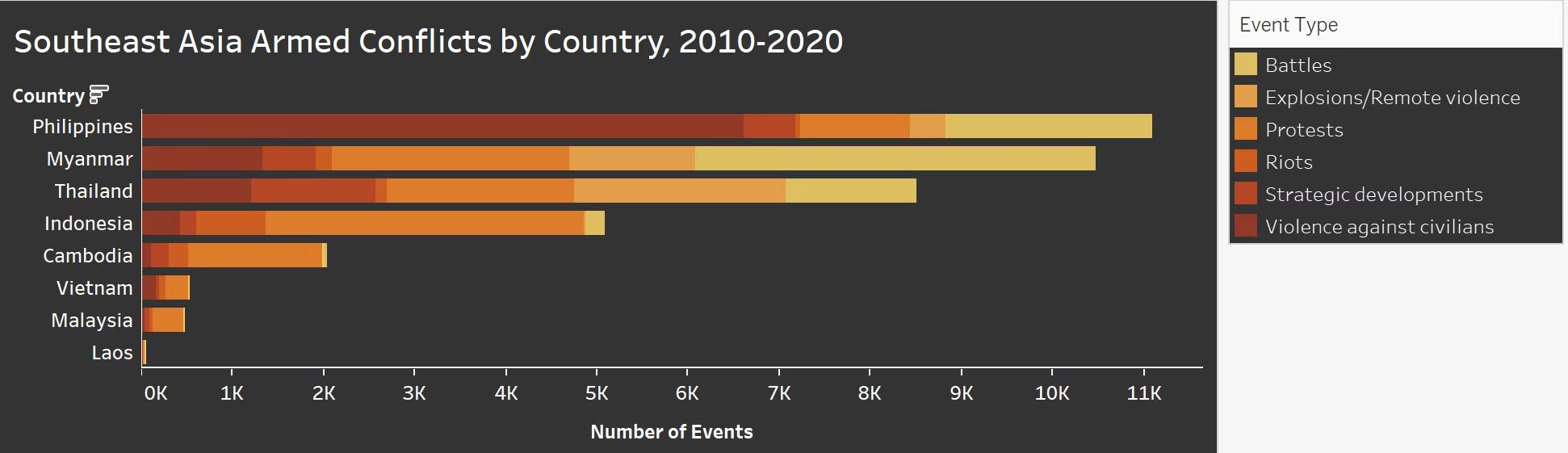 - During ten years from 2010 to 2020, Philippines, Myanmar, and Thailand have relatively great number of armed conflicts, while Lao, Malaysia and Vietnam have much less armed conflicts among all the listed countries.