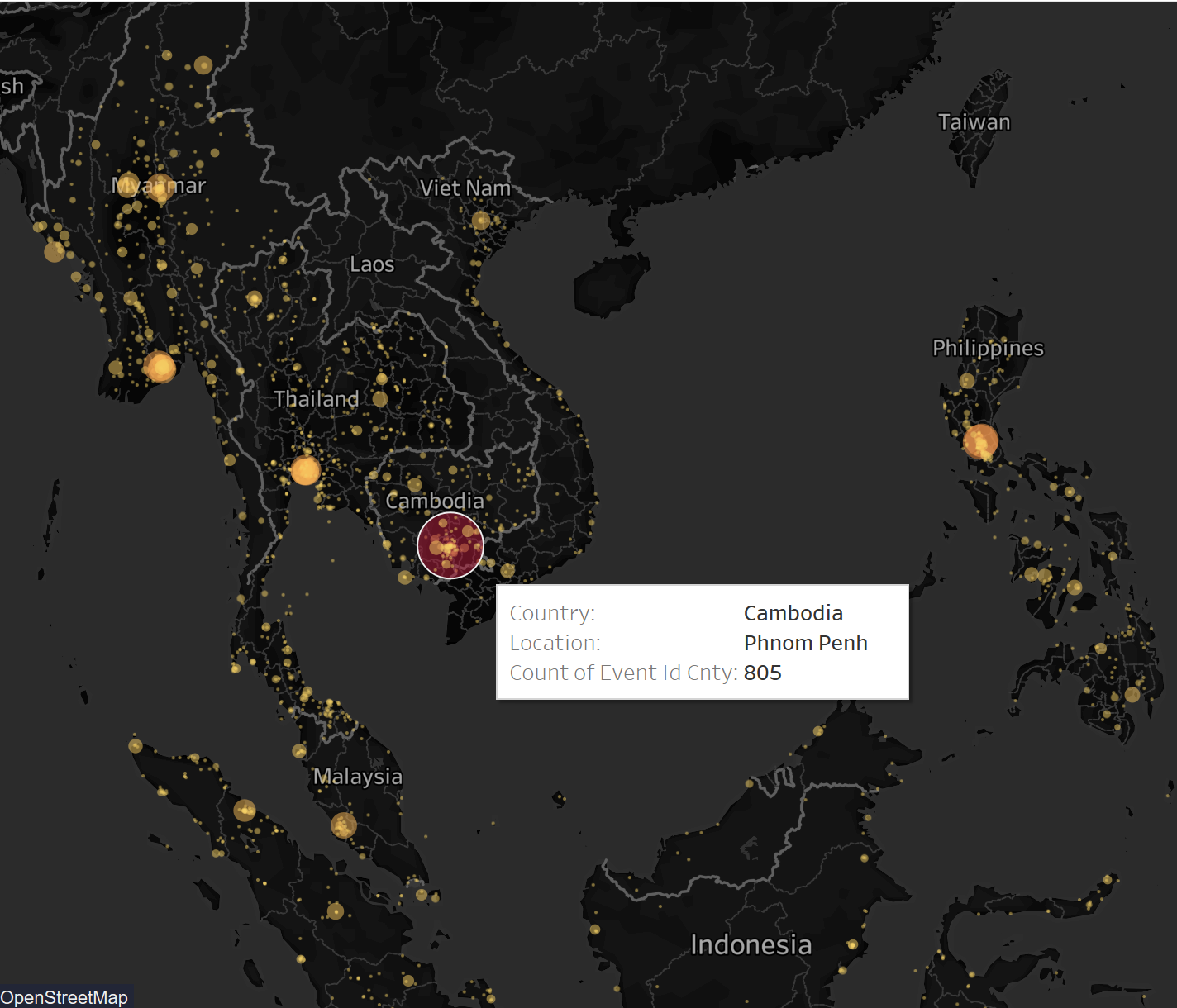 - Protests happened during 2010-2020 are scattered in other countries, but mostly concentrated in Phnom Penh, Cambodia.