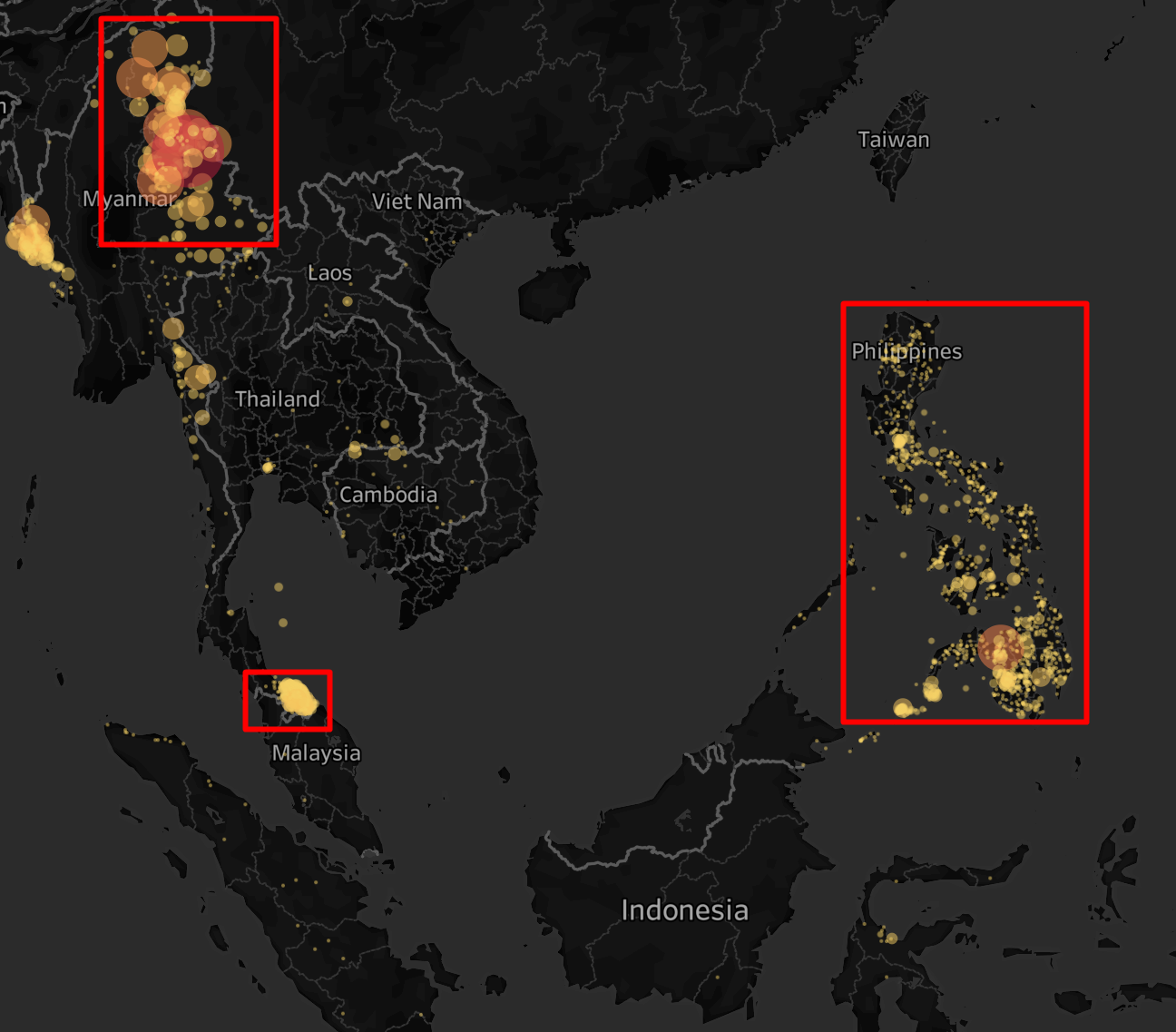 - Battles happened during 2010-2020 are mainly concentrated on northeast of Myanmar and south most of Thailand, both are around borders, while scatter all over Philippines.
