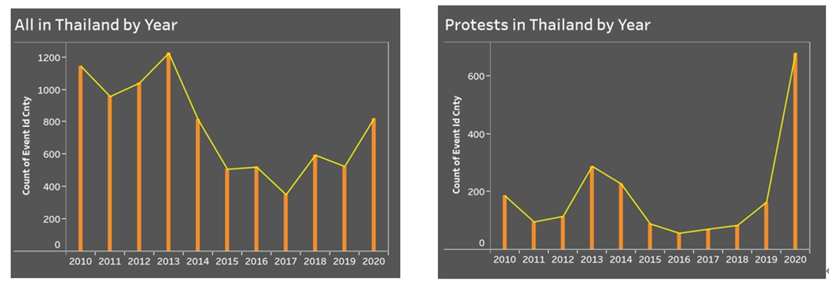 - In Thailand, the number of armed conflicts fluctuated during 2010-2020, and reached at peak in 2013. On top of that, number of protests rose sharply from 2019 to 2020.