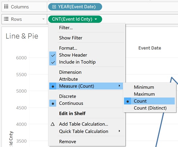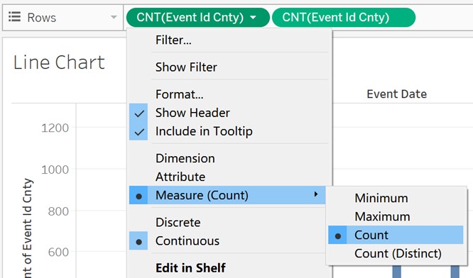 - Drag ‘Event Date’ and ‘Event Id Cnty’ to Columns and Rows respectively and set Measure of ‘Event Id Cnty’ as Count.