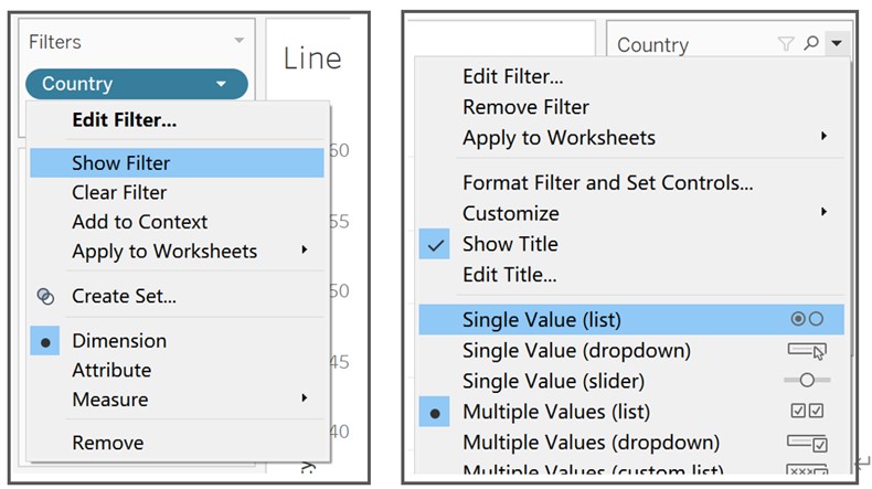 - Drag ‘Country’ to Filters and select Show Filter from the drop-down list. Change filter type to Single Value (list).