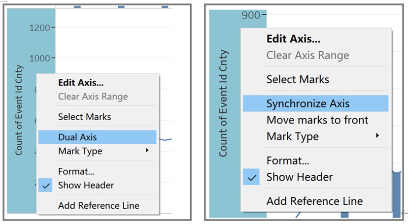 - Right click the y-axis of line chart and select Dual Axis, then right click the merged y-axis and select Synchronize Axis.